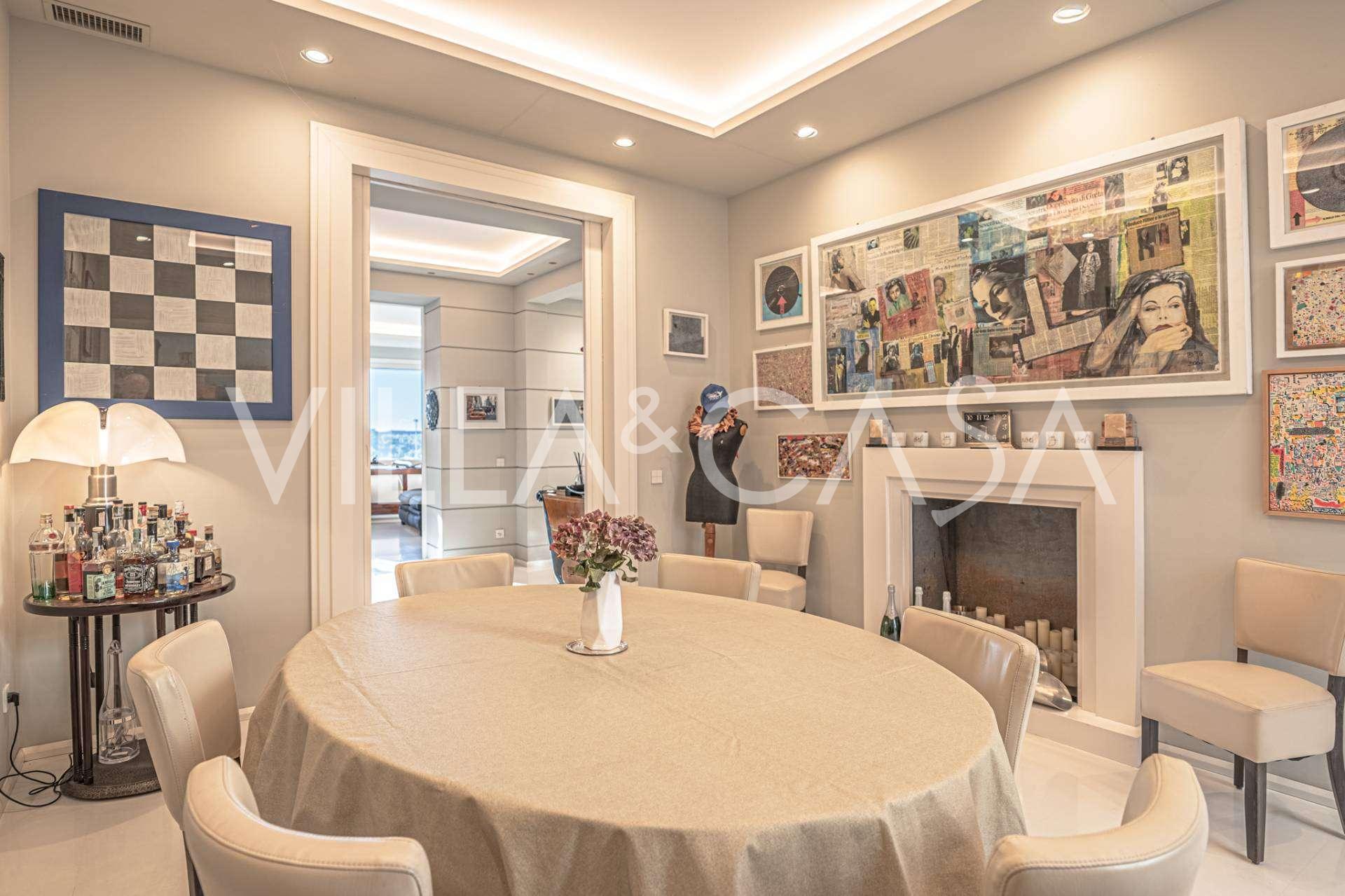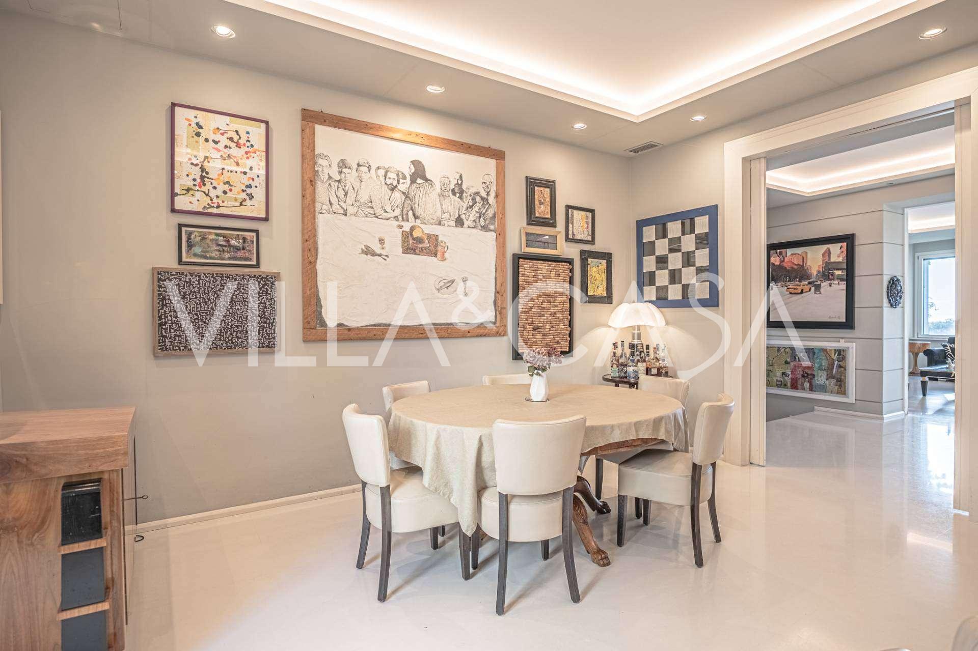 Na pierwszym piętrze cyfrowe, opancerzone drzwi prowadzą do wyrafinowanego salonu typu open space, idealnie nadającego się do przyjmowania gości. Nowoczesna, w pełni wyposażona kuchnia połączona jest z formalną jadalnią, która wychodzi na urokliwy prywatny ogród wewnętrzny: oazę spokoju i prywatności, idealną do odpoczynku lub organizacji ekskluzywnych wydarzeń. Elegancka łazienka dla gości dopełnia to piętro.