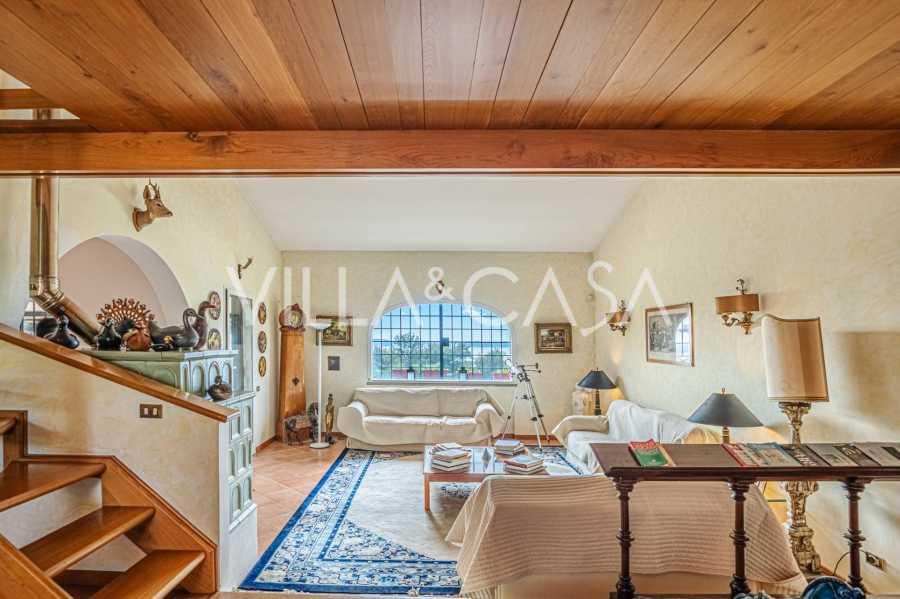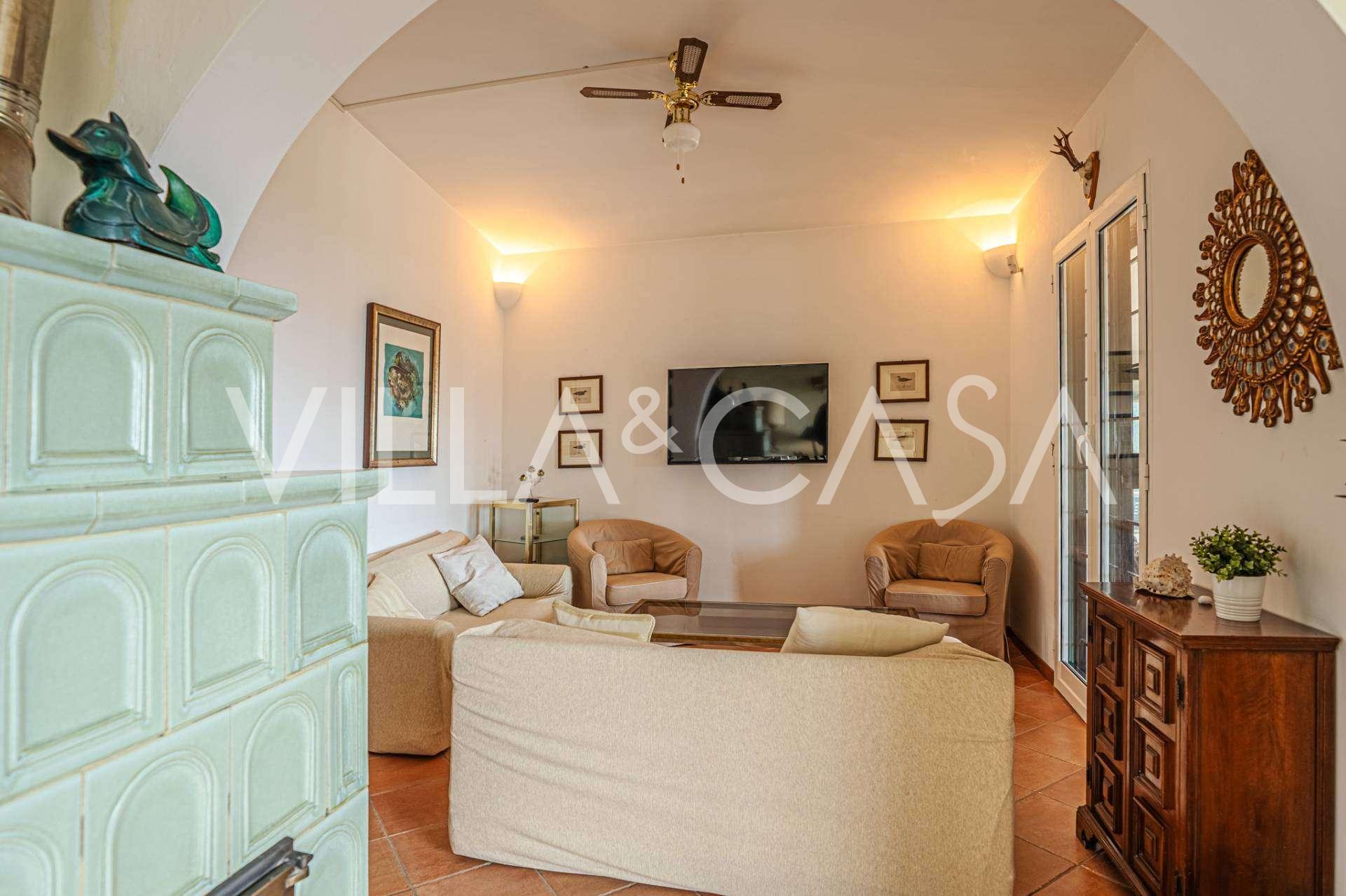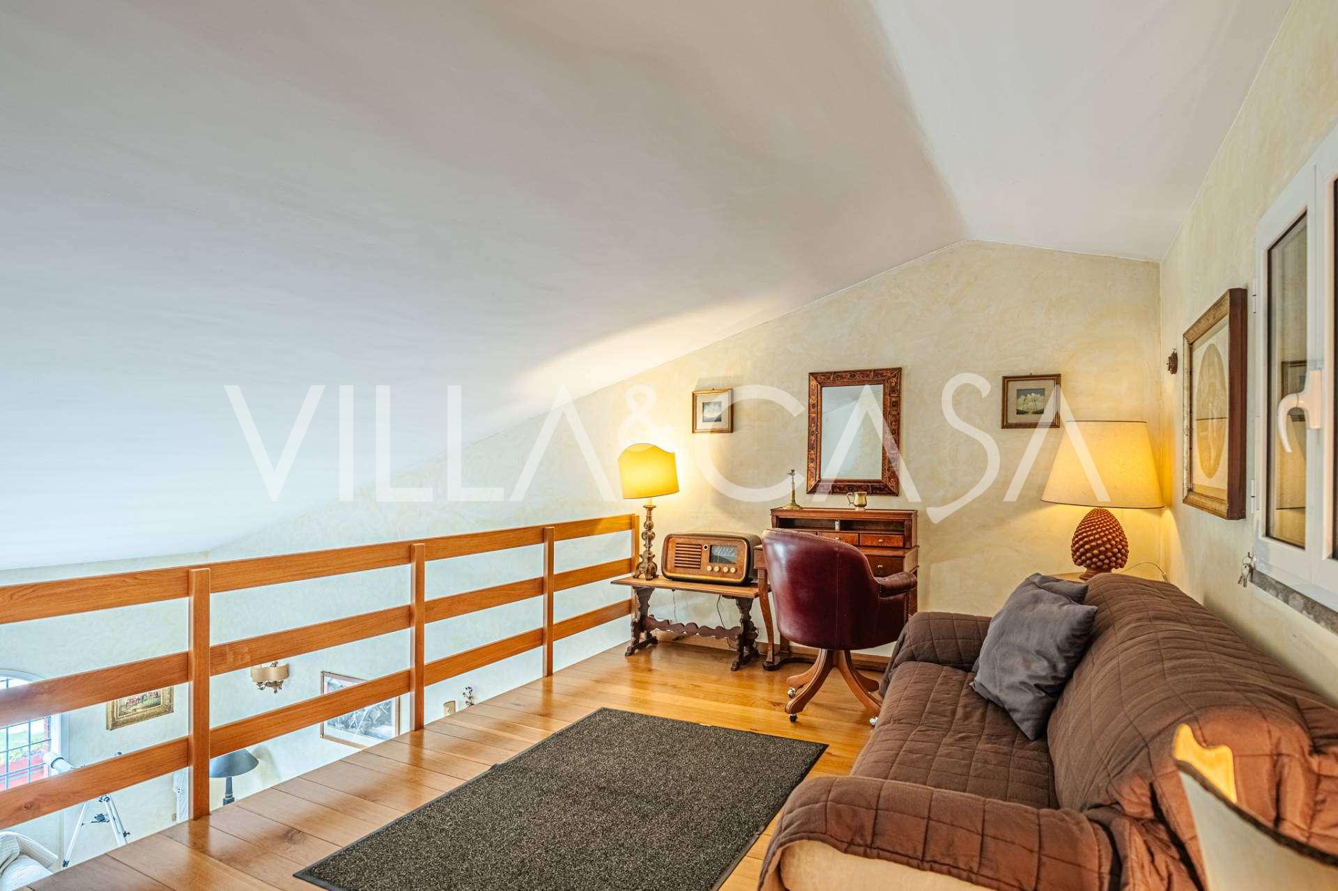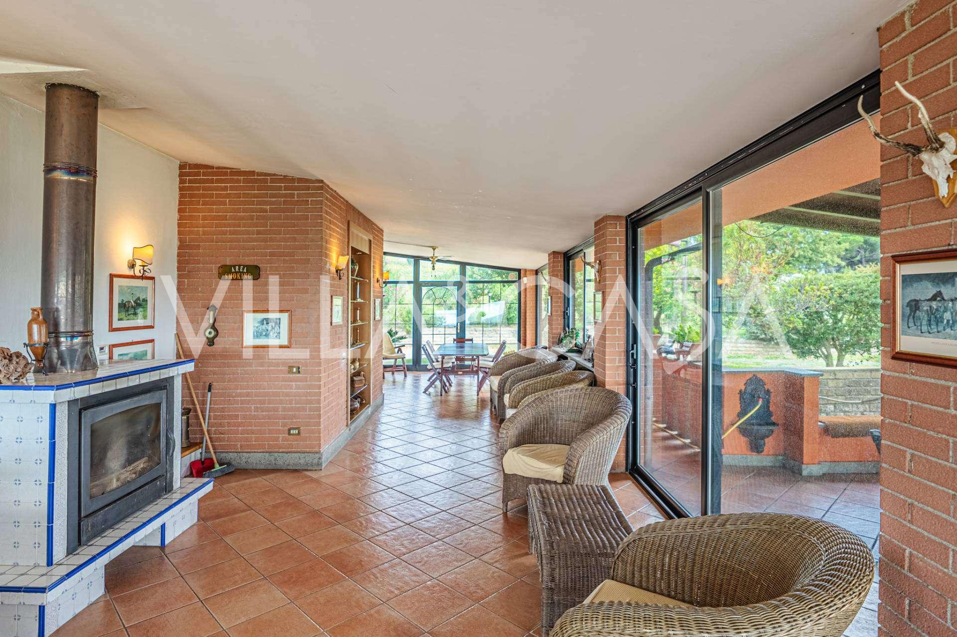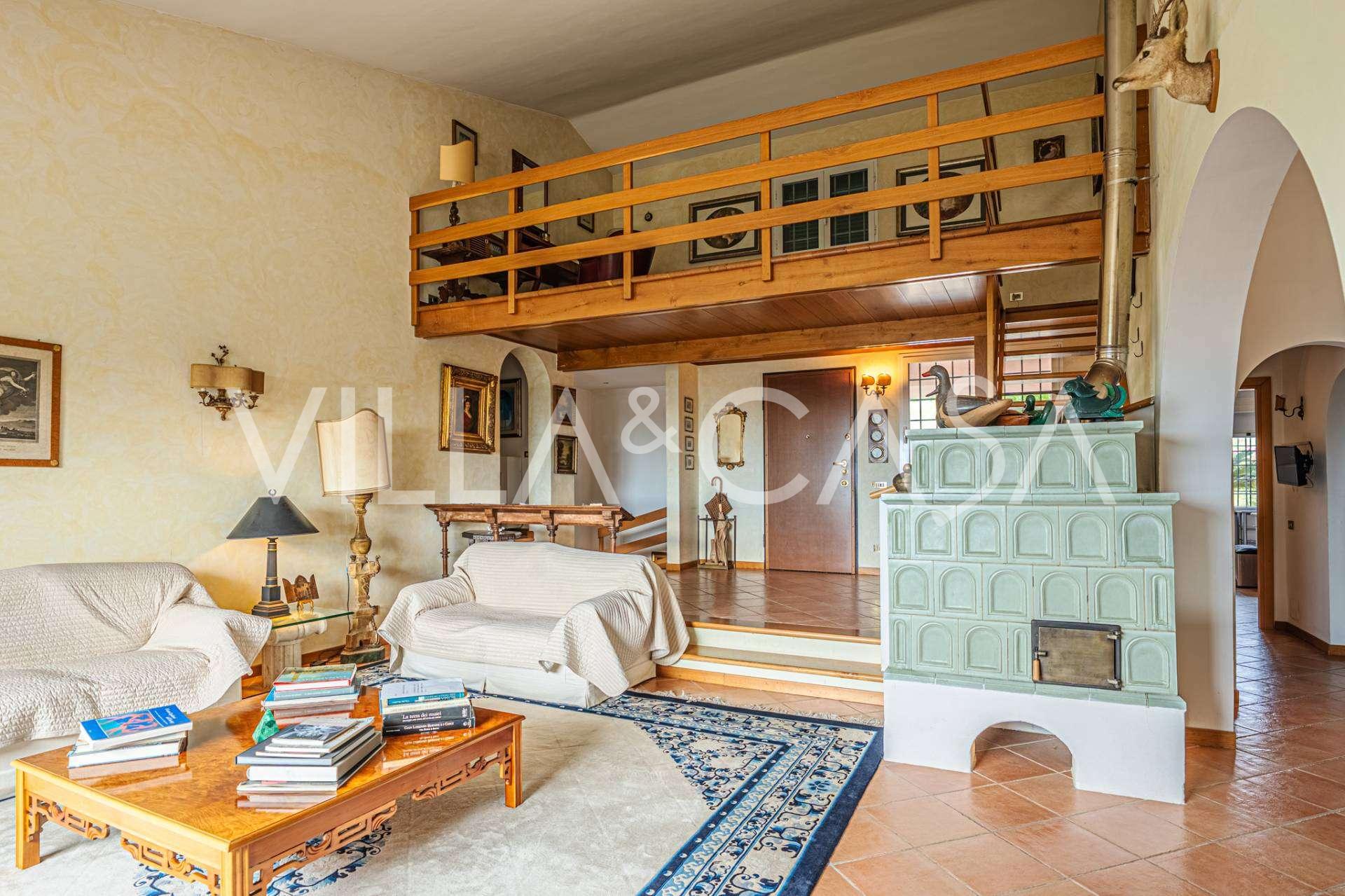 La villa dispone di 4 camere da letto e 4 eleganti bagni, che permettono di sistemarsi comodamente e sentirsi a proprio agio. Gli interni sono curati nei minimi dettagli: un maestoso soggiorno con soffitto alto e camino, un angolo accogliente con divano sul soppalco, una spaziosa cucina, lavanderia, due luminose verande con finestre panoramiche che si affacciano sul parco, oltre a un'area giochi con biliardo, freccette, ping pong e calcio balilla.