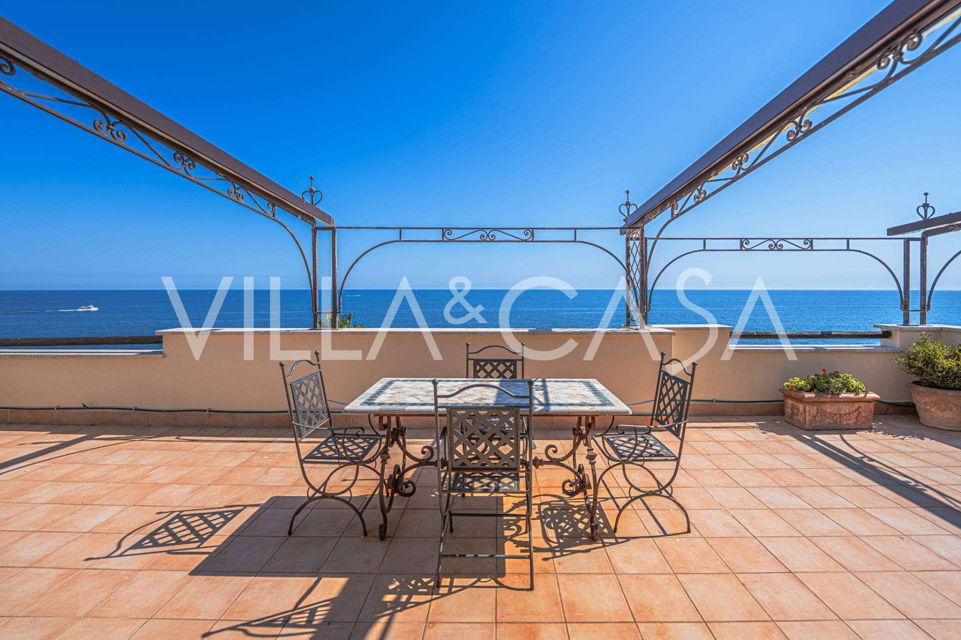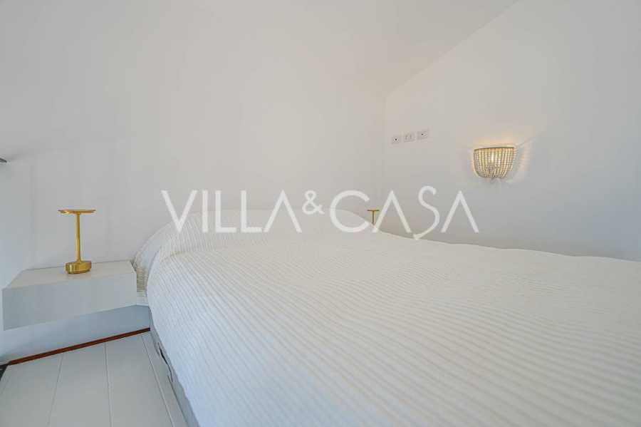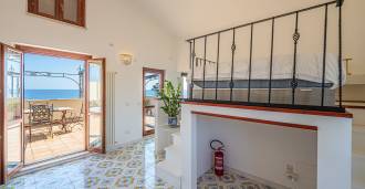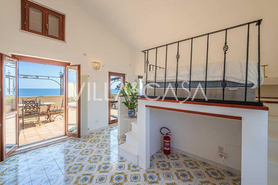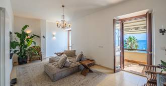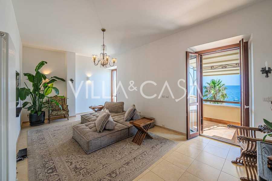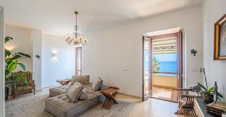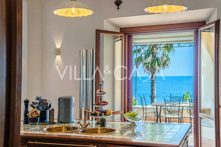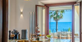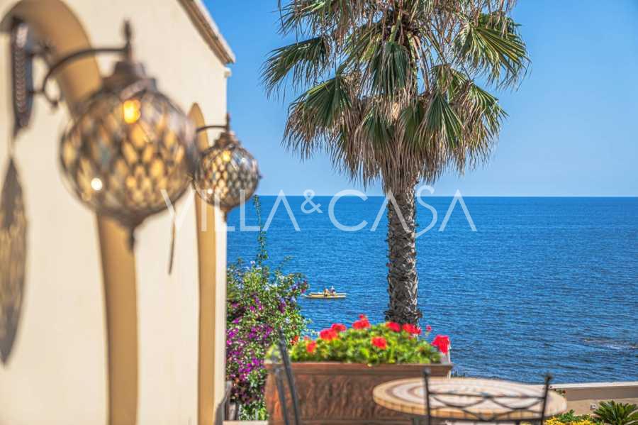 Okna oferują panoramiczny widok 180 stopni na morze, niebieski horyzont wypełnia każde wnętrze i rozciąga się aż do szerokich panoramicznych tarasów. Wnętrza, z wysokimi sufitami ponad trzy metry, terakotowymi podłogami z tamtych czasów, marmurowymi schodami i kominkiem, tworzą atmosferę wyrafinowanej, ponadczasowej elegancji.
