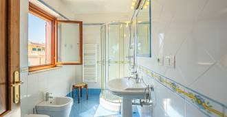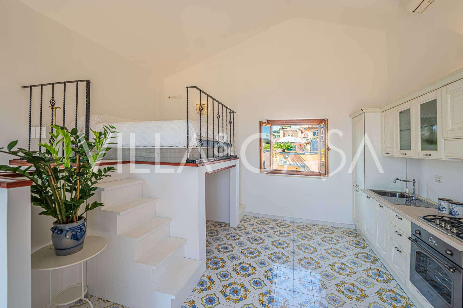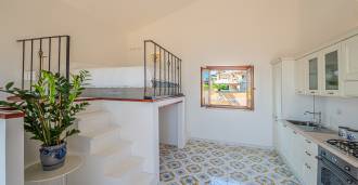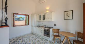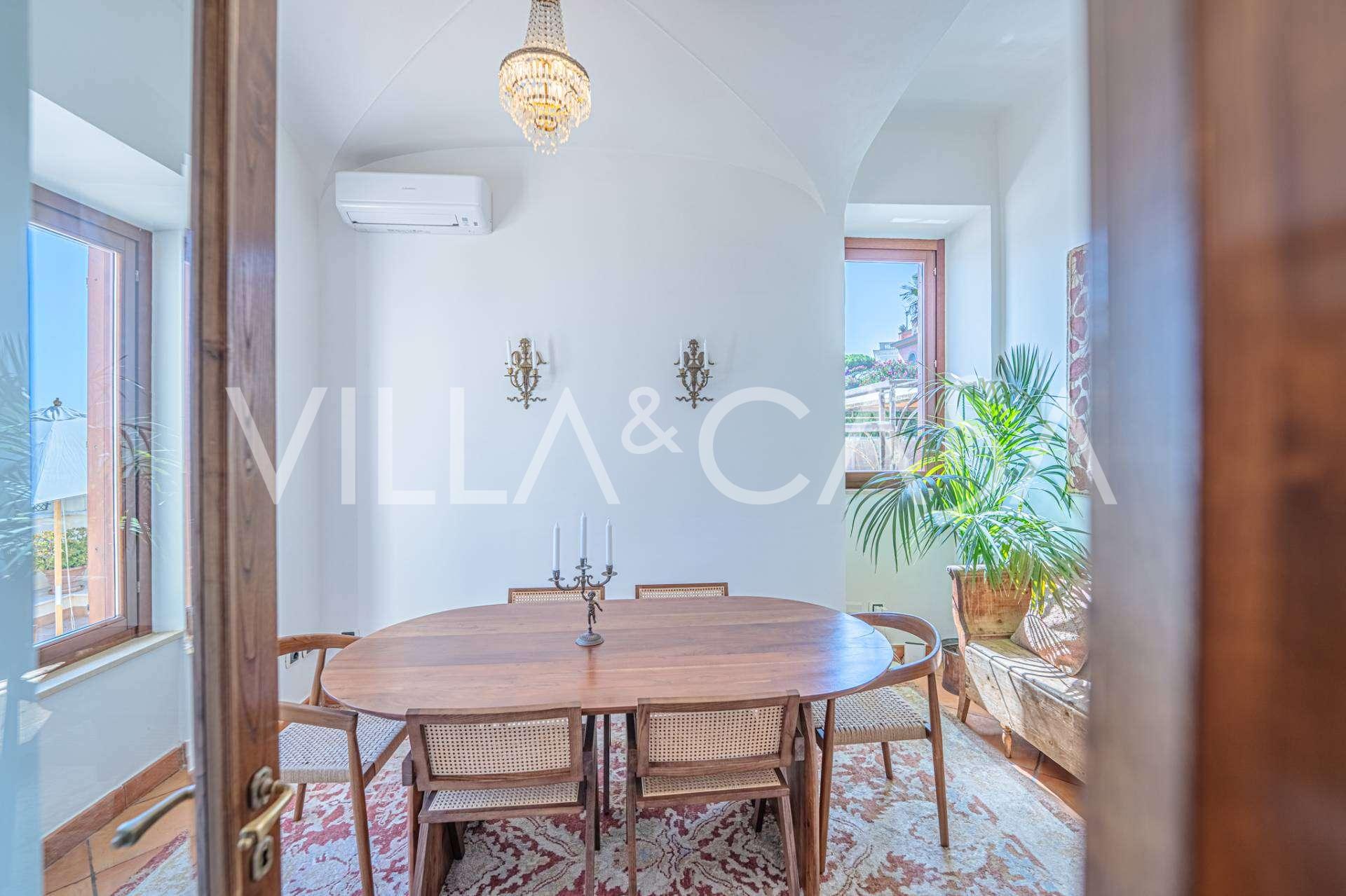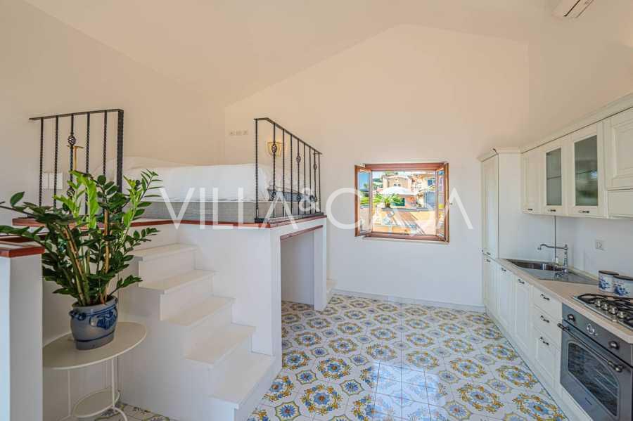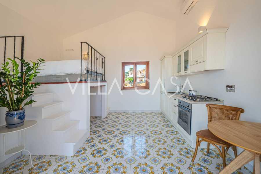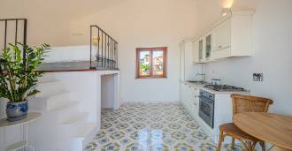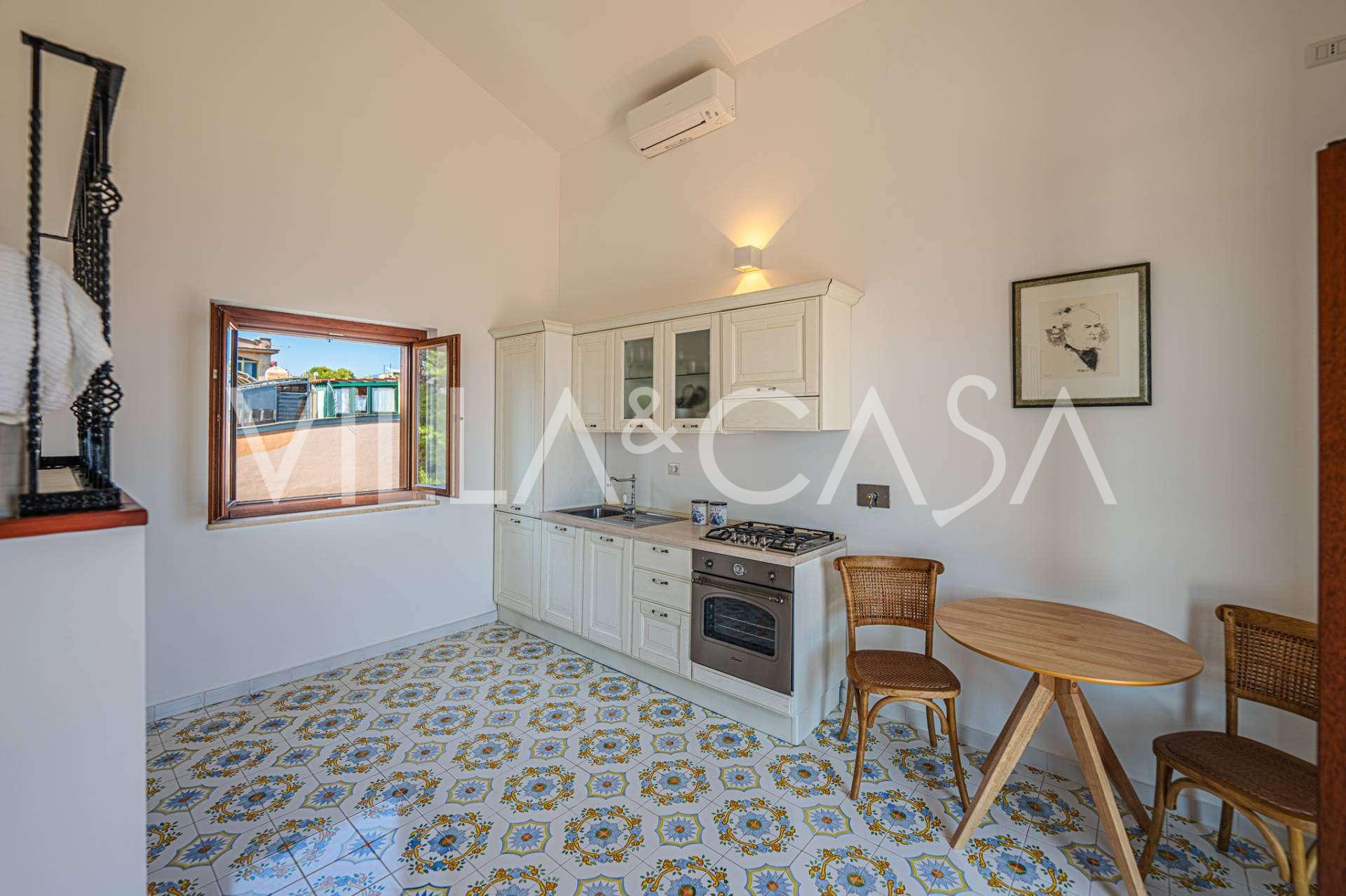 Główna część dzienna, ozdobiona dużymi oknami, wychodzi na taras, idealnie nadający się do spotkań i podziwiania rzadkich zachodów słońca. Kuchnia, wykonana ręcznie na zamówienie, łączy estetykę i funkcjonalność, z wyspą ozdobioną malowanymi kafelkami z Positano i oryginalnymi miedzianymi zlewami.