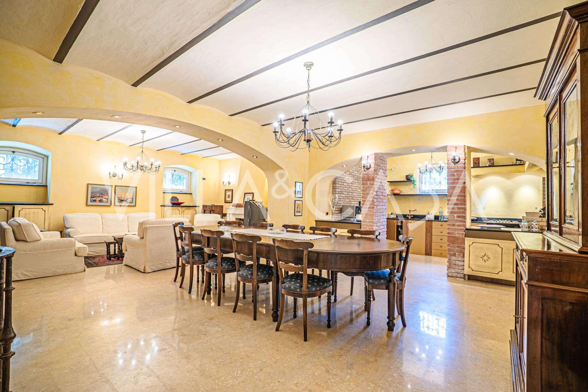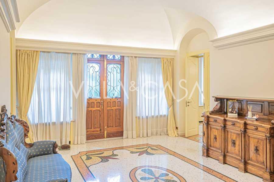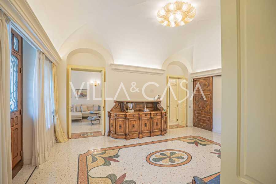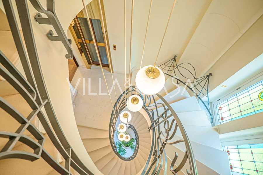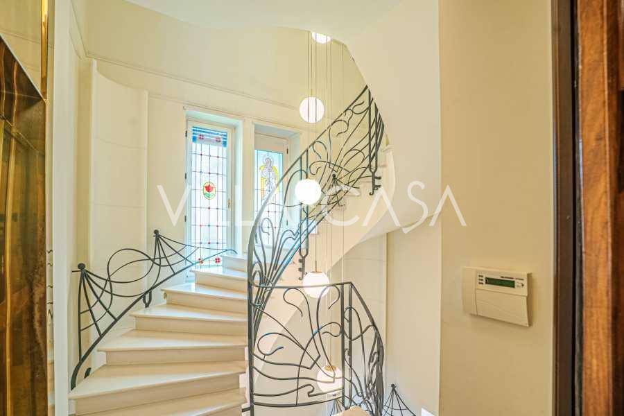 Ta prestiżowa rezydencja o powierzchni około 2000 m² rozciąga się na 6 poziomach, z których dwa znajdują się pod ziemią. Wszystkie piętra połączone są spiralnymi schodami z białego marmuru z eleganckimi kutymi poręczami, a także windą, zapewniającą komfortowe przemieszczanie się między poziomami. Wnętrza są pełne światła dzięki wysokim oknom z ręcznie wykonanymi witrażami, w domu zachowano stare kominki z terakotowymi kominami, wykonanymi przez mistrzów z Albisoli według oryginalnych wzorów.