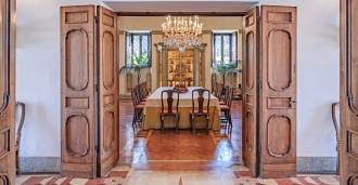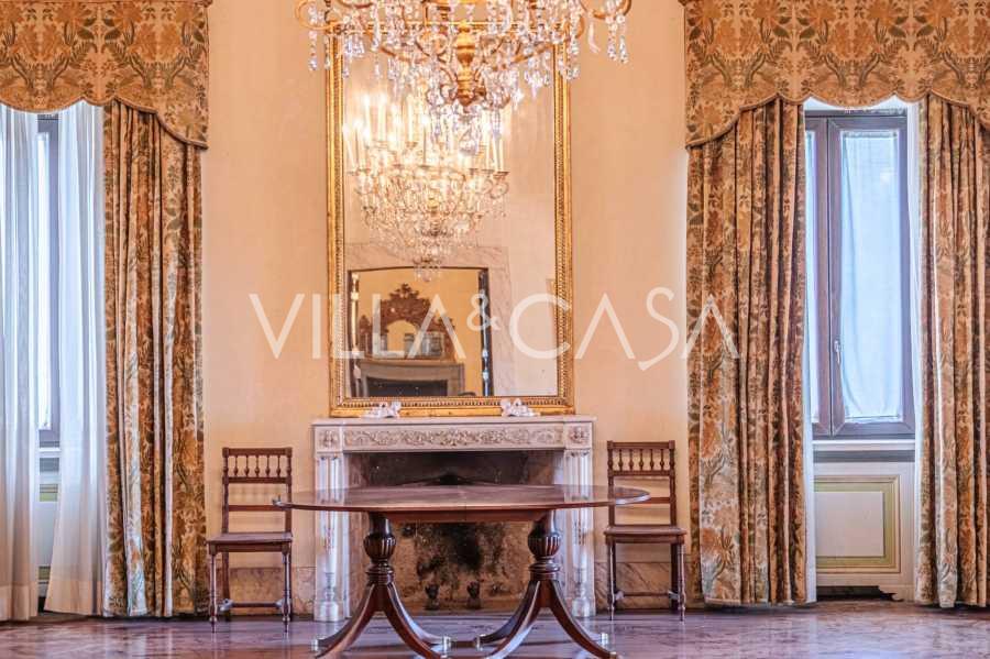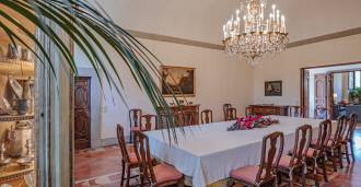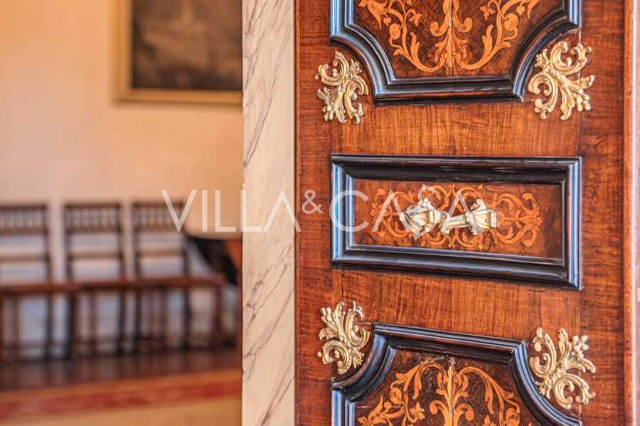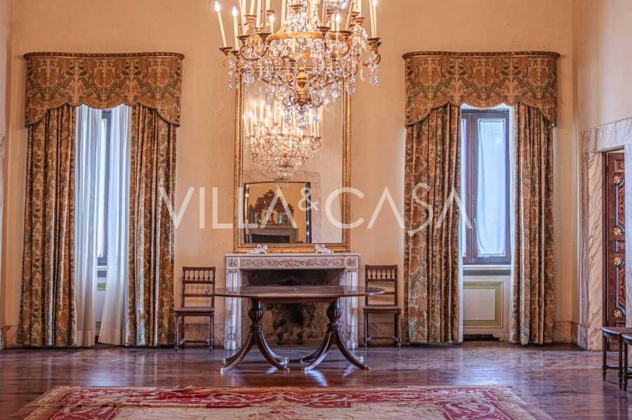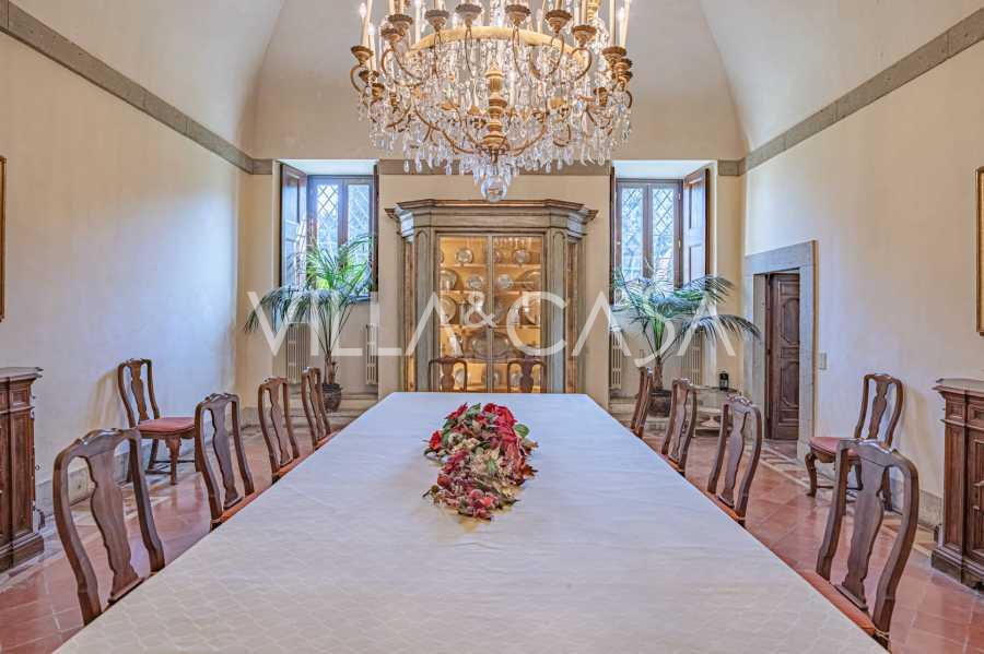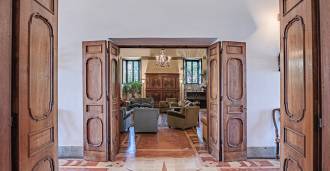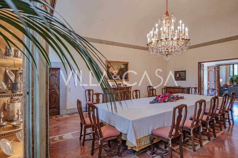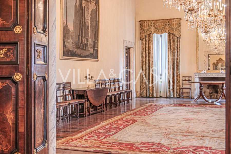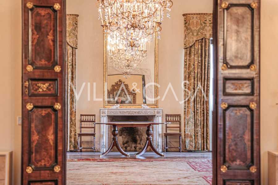 Na parterze znajdują się przestronne sale recepcyjne, gabinet, sypialnia, trzy łazienki, wykwintna jadalnia oraz duża kuchnia, która kontynuuje się na niższym poziomie, gdzie znajduje się sala bankietowa, idealna na uroczystości.