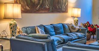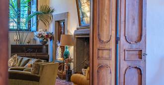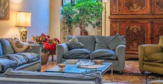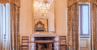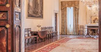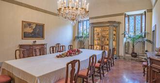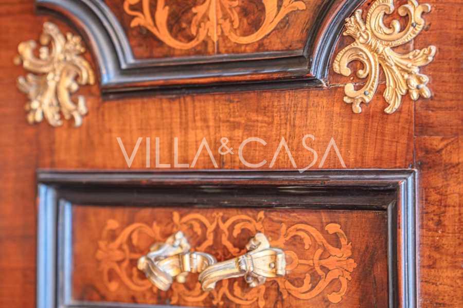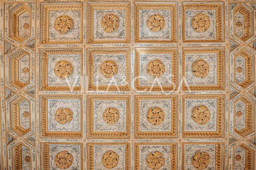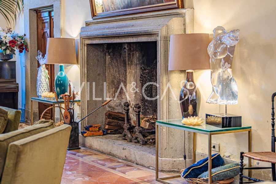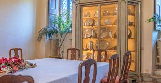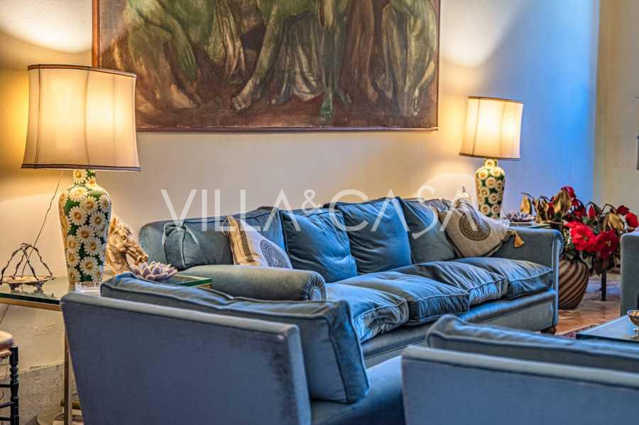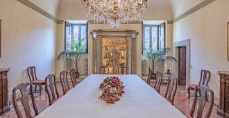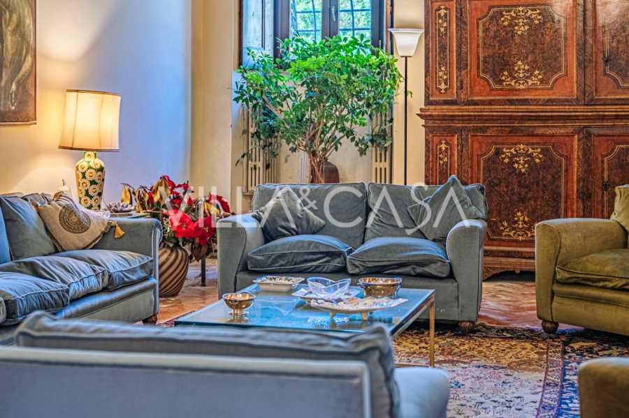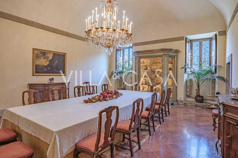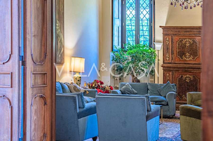 Na parterze znajdują się przestronne sale recepcyjne, gabinet, sypialnia, trzy łazienki, wykwintna jadalnia oraz duża kuchnia, która kontynuuje się na niższym poziomie, gdzie znajduje się sala bankietowa, idealna na uroczystości.